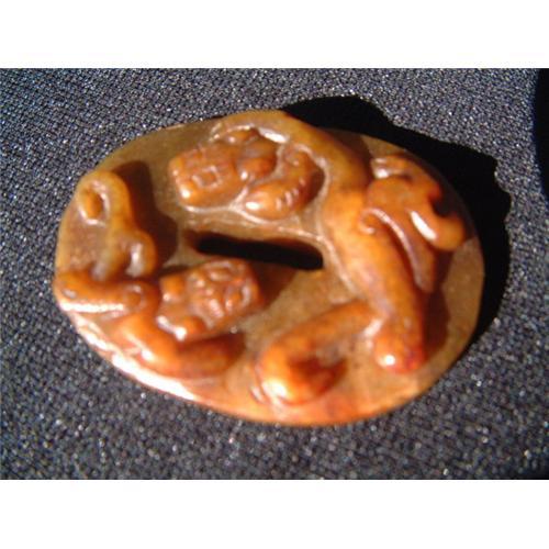 Yellowish-brown jade oval tablet dating to Western Han period. It features 2 facing dragons carved in high relief. The reverse side features dragons in bas relief and C-scrolls decorations. This is an exquisite jade carving of Western Han period in pristine condition for the age. Size: 2" X 1.5" (5 cm. x 4 cm.). Estimated retail value: $1400. Provenance: Dr. Veleanu's jade collection, the author of the collectors'textbook: "Jade, 5000 BC to 1912 AD, Guide to collectors".