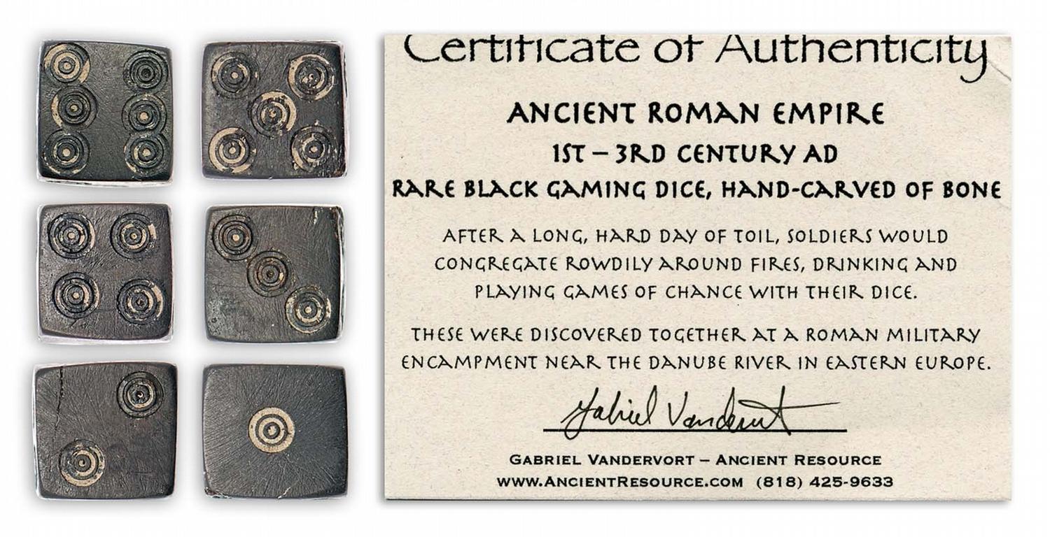 ANCIENT ROMAN ARTIFACTS w/AUTHENTICITY CARD - 1st-3rd century AD - BLACK GAMING DICE! Ancient rare pair of black bone gaming dice/LOTS, 9mm dia. each.