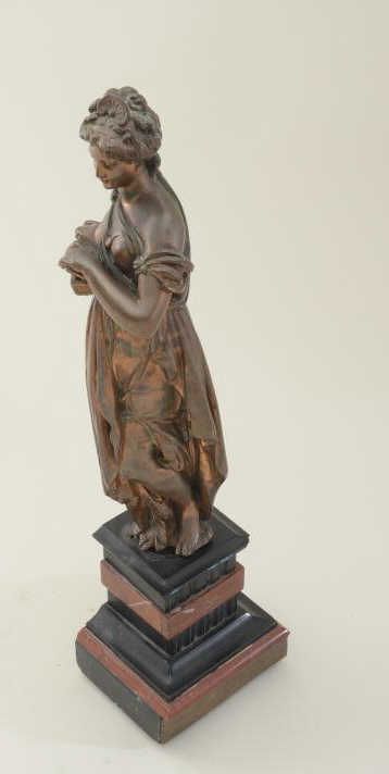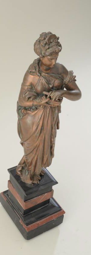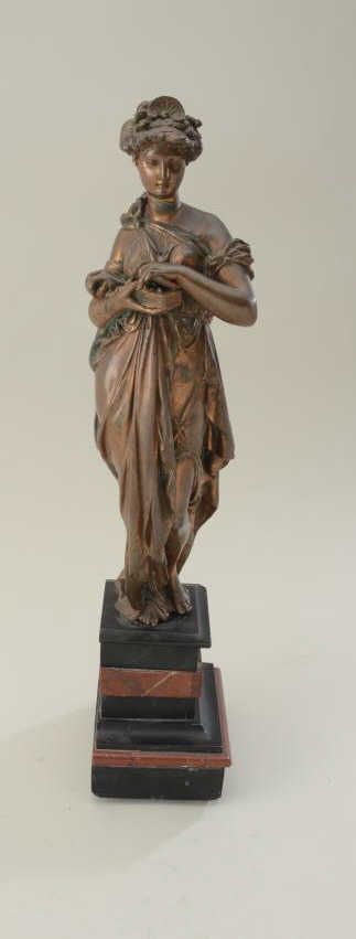 Ancient style goddess in art metal casting on fancy layered stone base. 20" in height. Copper finish. Est: $300 - $600