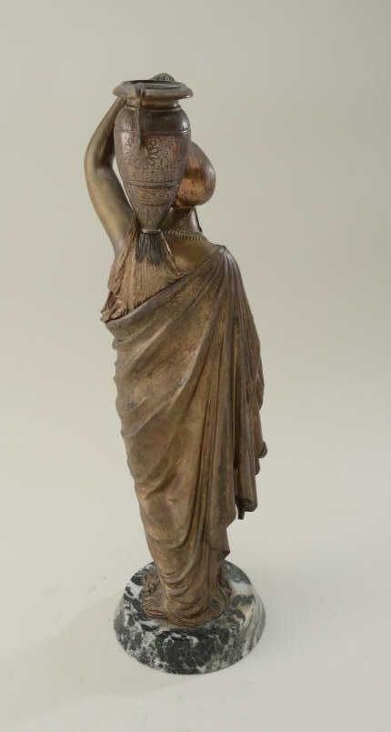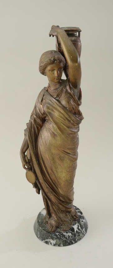 Ancient style lady with vase in art metal. Cast 19th century on stone base. Approx. 19-1/2" in height including base. Bronze/Gold finish. Est: $300 - $600
