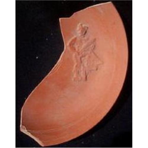 Roman red slip redware large fragment from a bowl bearing a relief design of a standing figure probably representing Lars. Size: 6.5 inches x 3 inches. Provenance: Harmer Rooke Galleries, NYC, auction of June 1990. Appraised at $550.