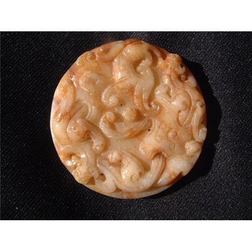 Exquisite Eastern Zhou period round yellowish green jade funerary disk decorated with hydra dragons in high relief. The reverse side is decorated with in bas relief with 4 tao tieh and sprouting rice grain pattern. Perforated half way in the center. Size: diameter is 2.3" (6 cm.).