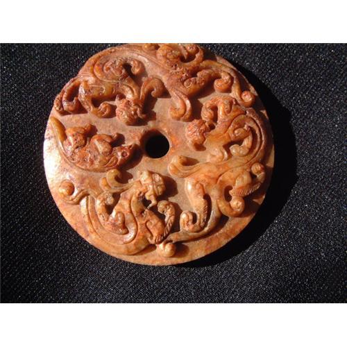 Exquisite Eastern Zhou period round yellowish red jade disk decorated with 3 hydra dragons in high relief, separated by a rat (zodiac sign). The reverse side is not decorated. Size: diameter is 2.3" (6 cm.).
