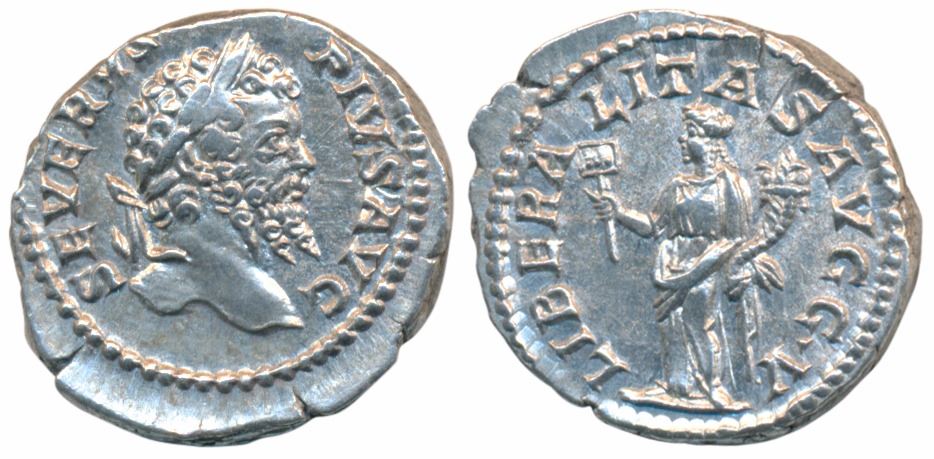 Roman, Septimius Severus, Silver Denarius, 3.68g, obv. laureate head to right with legend SEVERVS PIVS AVG around, rev. Liberalitas standing with abacus and cornucopia (RIC 276). Extremely Fine.