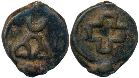 Ancient Deccan, Biface Uninscribed Cast Copper, Heavy Unit, 9.71g, Obv: Three-arched hill surmounted by crescent, Rev: Open cross symbol. Patinated, extremely fine.