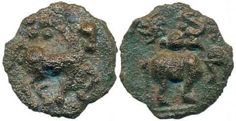 City State, Suktimati, Vatsa / Chedi Region, Copper Fractional Unit, 3.37g, Obv: Horse standing facing to right, Rev: Elephant walking to right with trunk upraised. Very fine, rare.