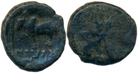 Ayodhya, Satyamitra, Copper, 7.03g, Obv: Bull standing facing left in front of a standard, Brahmi legend “Satymitrasa” below, Rev: Peacock / Swan to left and a palm tree to right. Very fine, rare.