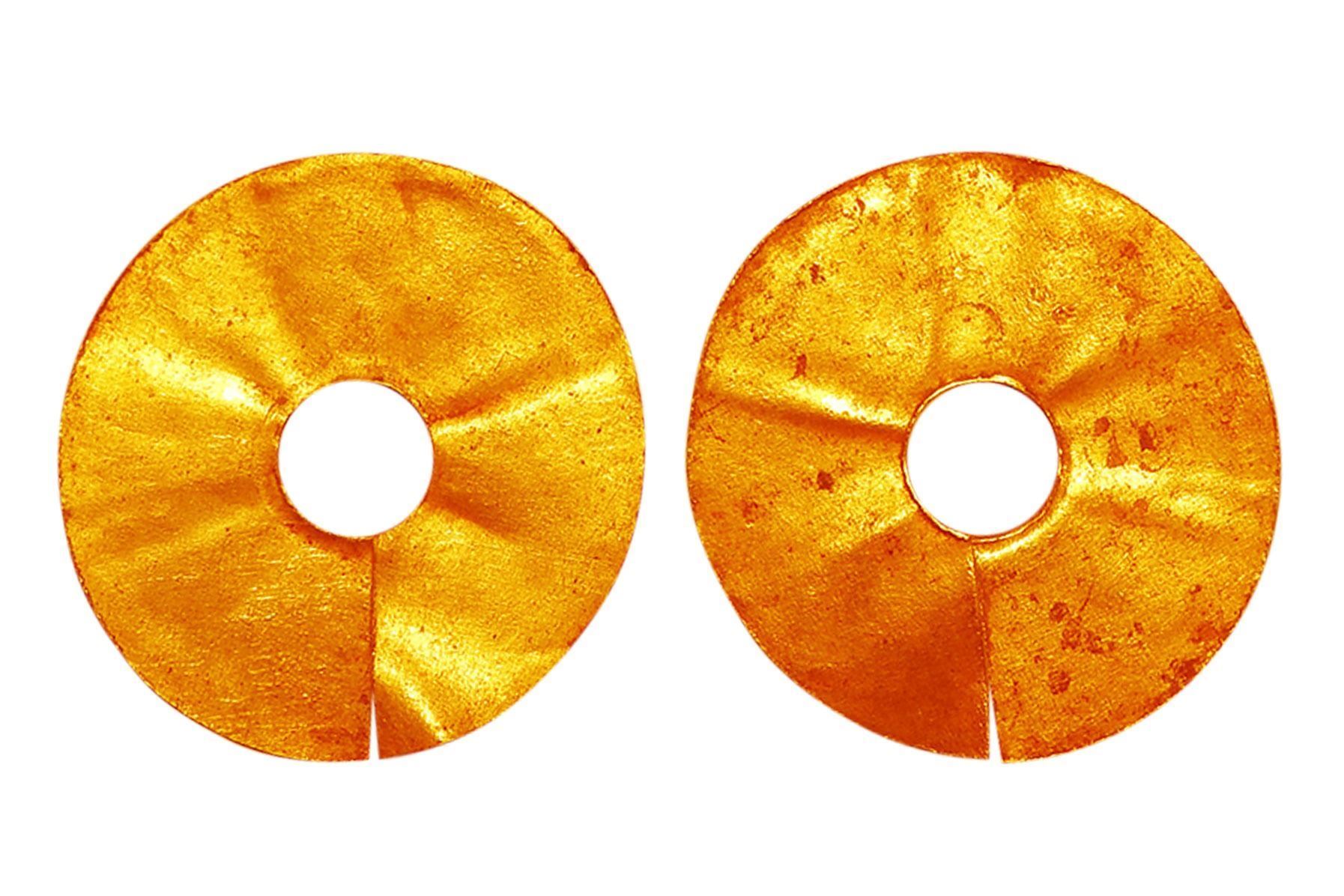 The Harappan civilization (3000-2500 BC), in the Indus Valley utilized gold disks, 1.0grms. 20.70mm, primarily crafted for necklaces, though they were reportedly also employed in trade. These disks likely served both as a store of value and a medium for exchange. Very Fine+, Very Rare denomination