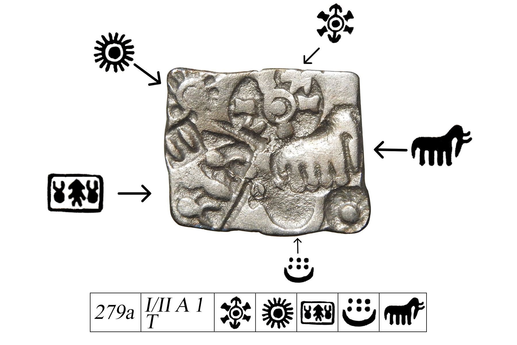 Archaic Punch-Marked Coinage from the Magadha Janapada, Nanda Dynasty (c. 343-321 BCE) – Silver Karshapana, Dalmau Hoard, weighing 3.3g, Transitional Series. The obverse features five prominent punches: 1. A six-armed symbol, 2. The sun, 3. A rectangle enclosing a fish between two taurines, 4. A crescent with six dots, 5. Magnificent Elephant This coin is from Series II of P.L. Gupta and T.R. Hardaker, catalogue number 279a. Transitional Series, bridging Series I and Series II, is a relatively recent discovery