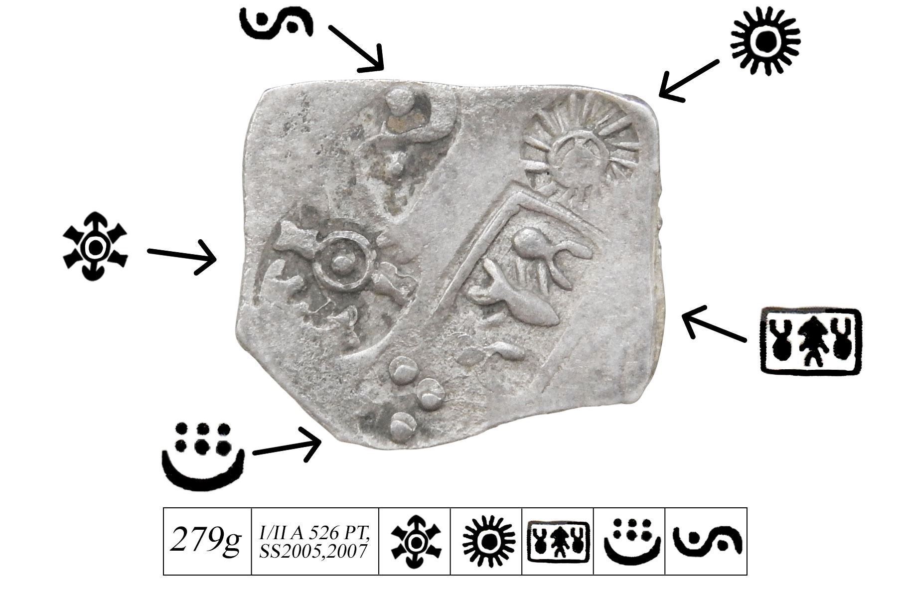 Archaic Punch-Marked Coinage from the Magadha Janapada, Nanda Dynasty (c. 343-321 BCE) – Silver Karshapana, Dalmau Hoard, weighing 3.2g, Transitional Series. The obverse features five prominent punches: 1. A six-armed symbol, 2. The sun, 3. A rectangle enclosing a fish between two taurines, 4. A crescent with six dots, and 5. A wavy line with two dots in the arcs. This coin is from Series II of P.L. Gupta and T.R. Hardaker, catalogue number 279g. Transitional Series, bridging Series I and Series II, is a relatively recent discovery compared to other series. It is rare to witness a coin from this transitional phase