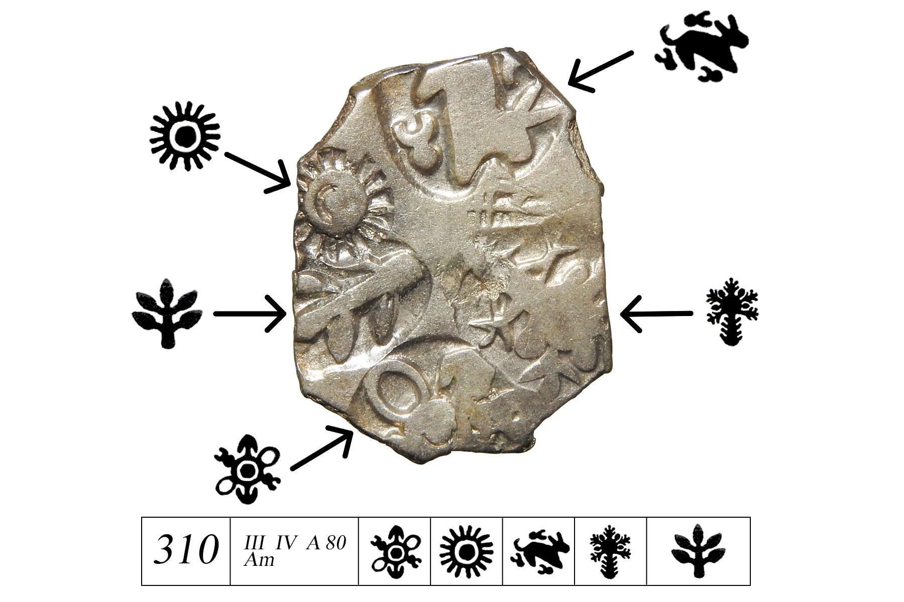 Archaic Punch-Marked Coinage from the Magadha Janapada, Nanda Dynasty (c. 343-321 BCE) – Silver Karshapana, weighing 3.40g. The obverse features five distinct punches: 1. A six-armed symbol, 2. The sun, 3. A rabbit facing right with three taurine symbols surrounding its body, 4. A coconut palm, and 5. A plant. The reverse is marked with an intriguing countermark of a dot surrounded by five crescents. This coin belongs to Series III of P.L. Gupta and T.R. Hardaker, catalogue number 310, Bold Punches, Scarce.