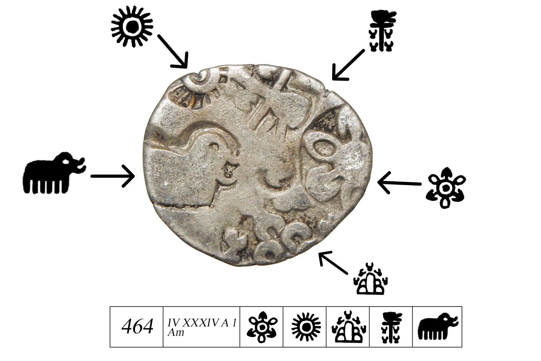 Archaic Punch-Marked Coinage from the Magadha Janapada, Nanda Dynasty (c. 343-321 BCE) – Silver Karshapana, weighing 3.0g , The obverse displays five prominent punches: 1. A six-armed symbol, 2. The sun, 3. Five arches on base, the central arch tall, Taurine above and two taurine on each side, 4. A triangle-headed standard facing right with two taurines beneath on each side. 5. An Elephant, this coin belongs to Series IVd, catalogue number 464, as recorded by P.L. Gupta and T.R. Hardaker. Scarce
