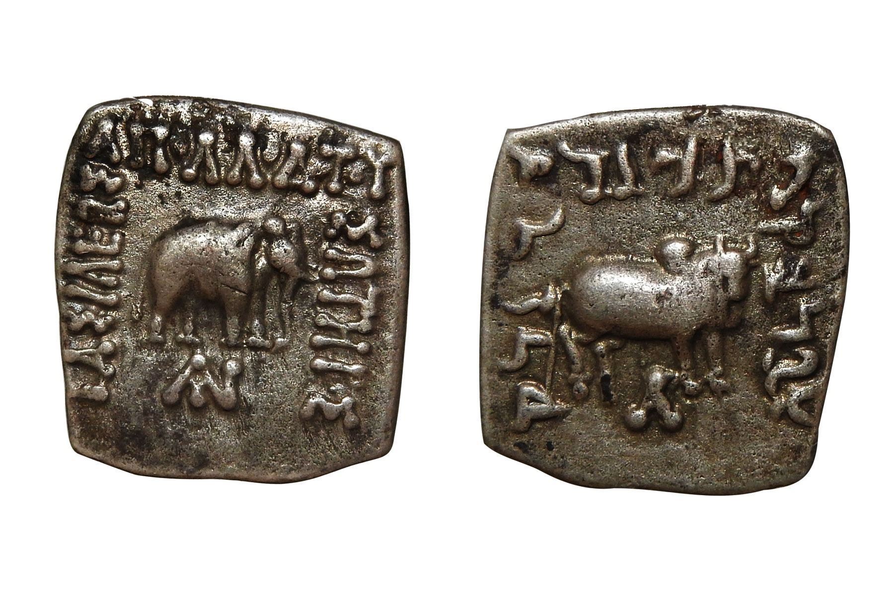 Indo-Greek Coinage, Apollodotos I (c. 174-165 BCE) – Silver Drachm, weighing 2.40g.Obv: featuring an elephant standing, with a monogram in the exergue. Rev: Maharajasa Apaladatasa tradarasa (of Great King Apollodotos the Savior), depicting a bull standing to the right, with a monogram in the exergue.