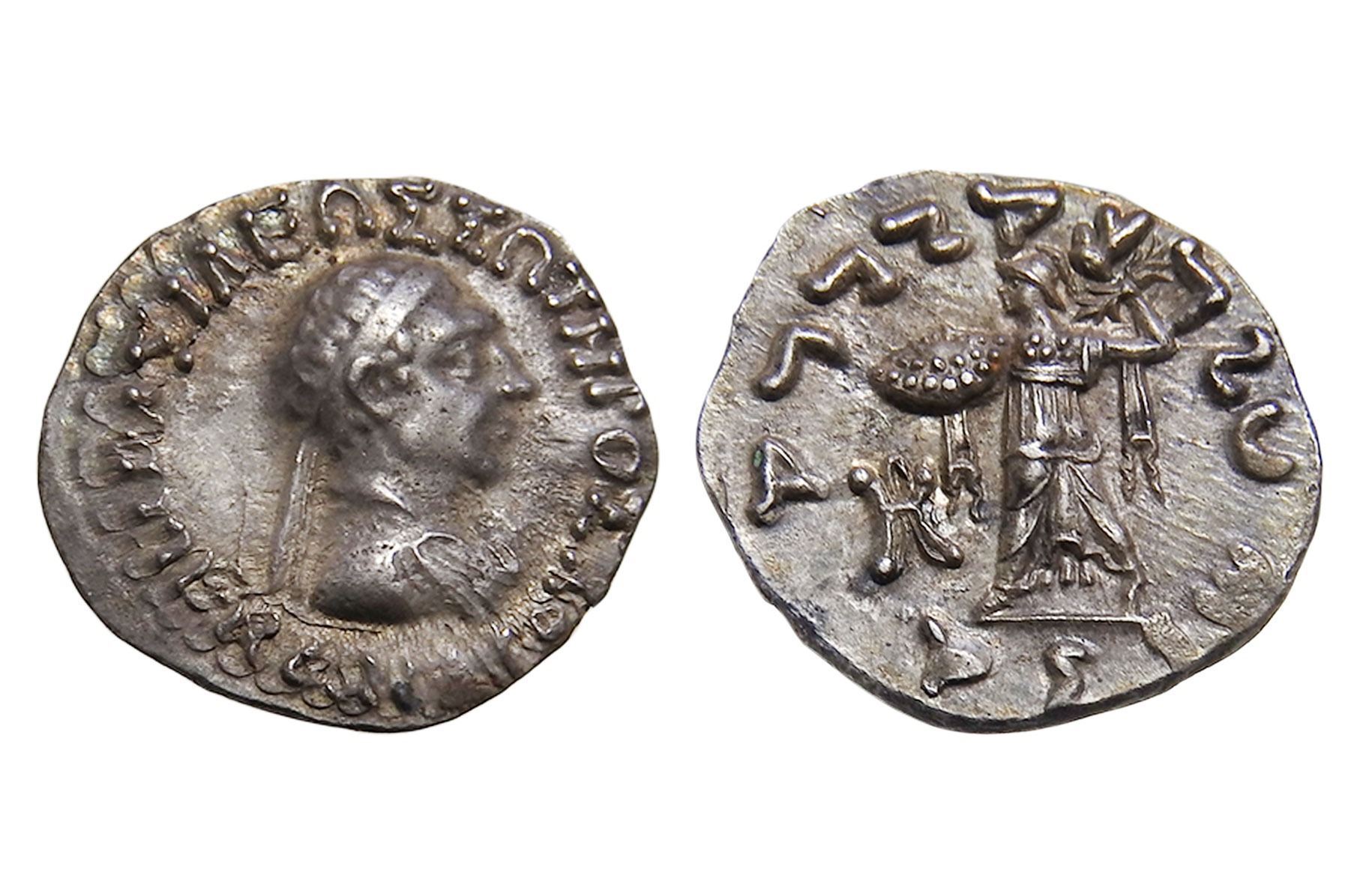 Indo-Greek Coinage, Menander I (c. 155-130 BCE) – Silver Drachm, weighing 2.40g. Obv: featuring a diademed bust of Menander I, facing right. Rev: Maharajasa tratarasa Menamdrasa (of Great King Menander the Savior), depicting Athena Promachos standing left, wielding a thunderbolt and holding an aegis. A monogram appears to the left. The coin was likely minted in the Paropamisadai or Gandhara region. It is cataloged in Bopearachchi Series 13, ODH#191, Extra Fine+, Rare in this condition.