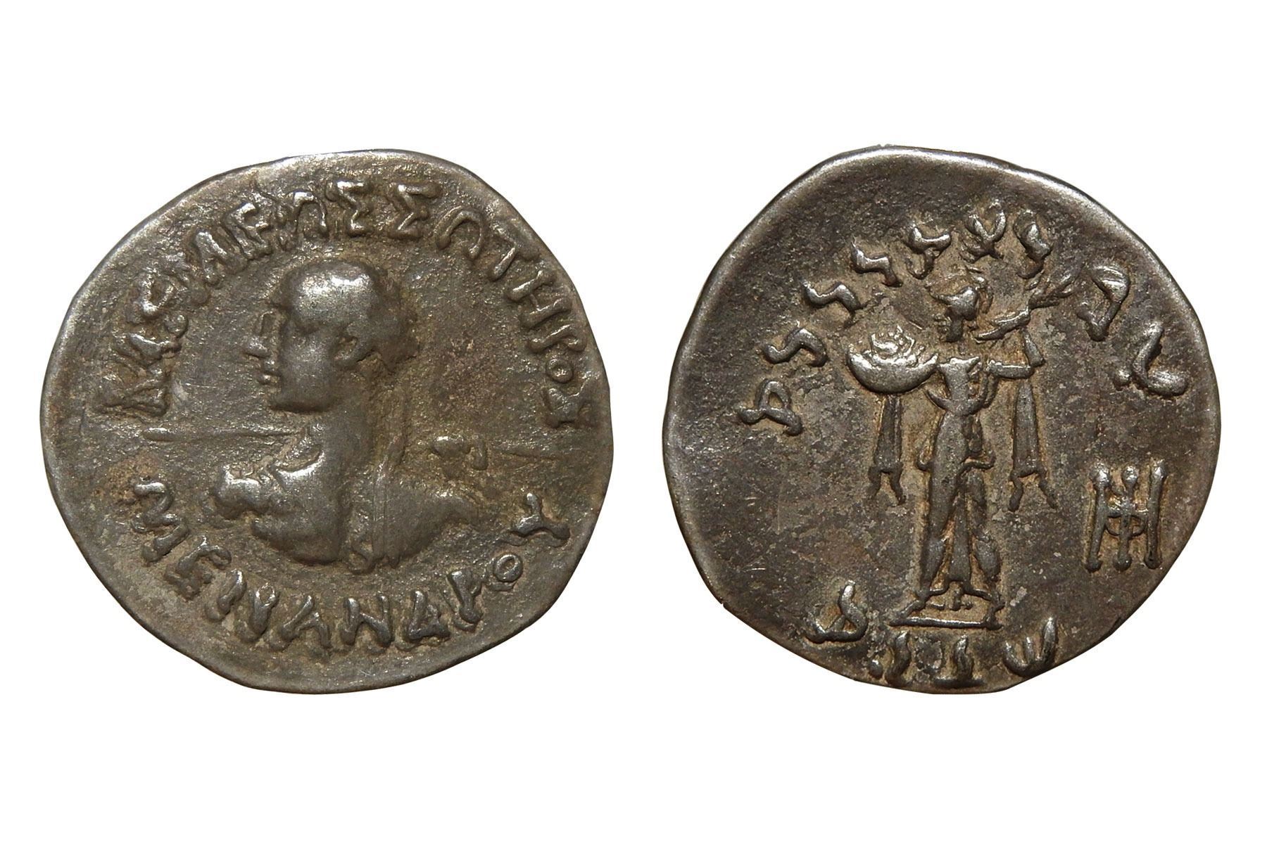 Indo-Greek Coinage, Menander I (c. 155-130 BCE) – Silver Drachm, weighing 2.30g. Obv: featuring a diademed heroic bust of Menander I, wearing an aegis and holding a spear, facing left. Rev: Maharajasa tratarasa Menamdrasa (of Great King Menander the Savior), depicting Athena Promachos standing right, wielding a thunderbolt and holding an aegis. A monogram appears to the right. The coin was likely minted in the Paropamisadai or Gandhara