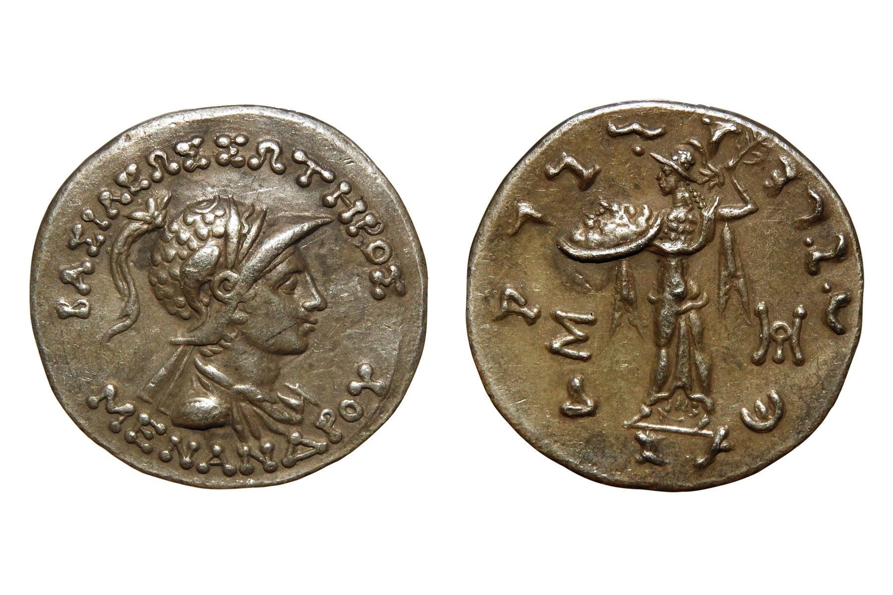 Indo-Greek Coinage, Menander I (c. 155-130 BCE) – Silver Tetradrachm, weighing 9.40g. Obv: featuring a diademed bust of Menander I wearing a scaled Boiotian helmet, facing right. Rev: Maharajasa tratarasa Menamdrasa (of Great King Menander the Savior), depicting Athena Promachos standing left, holding a thunderbolt and a shield. Monograms appear to the left and right. The coin was likely minted in the Paropamisadai or Gandhara region. Cataloged