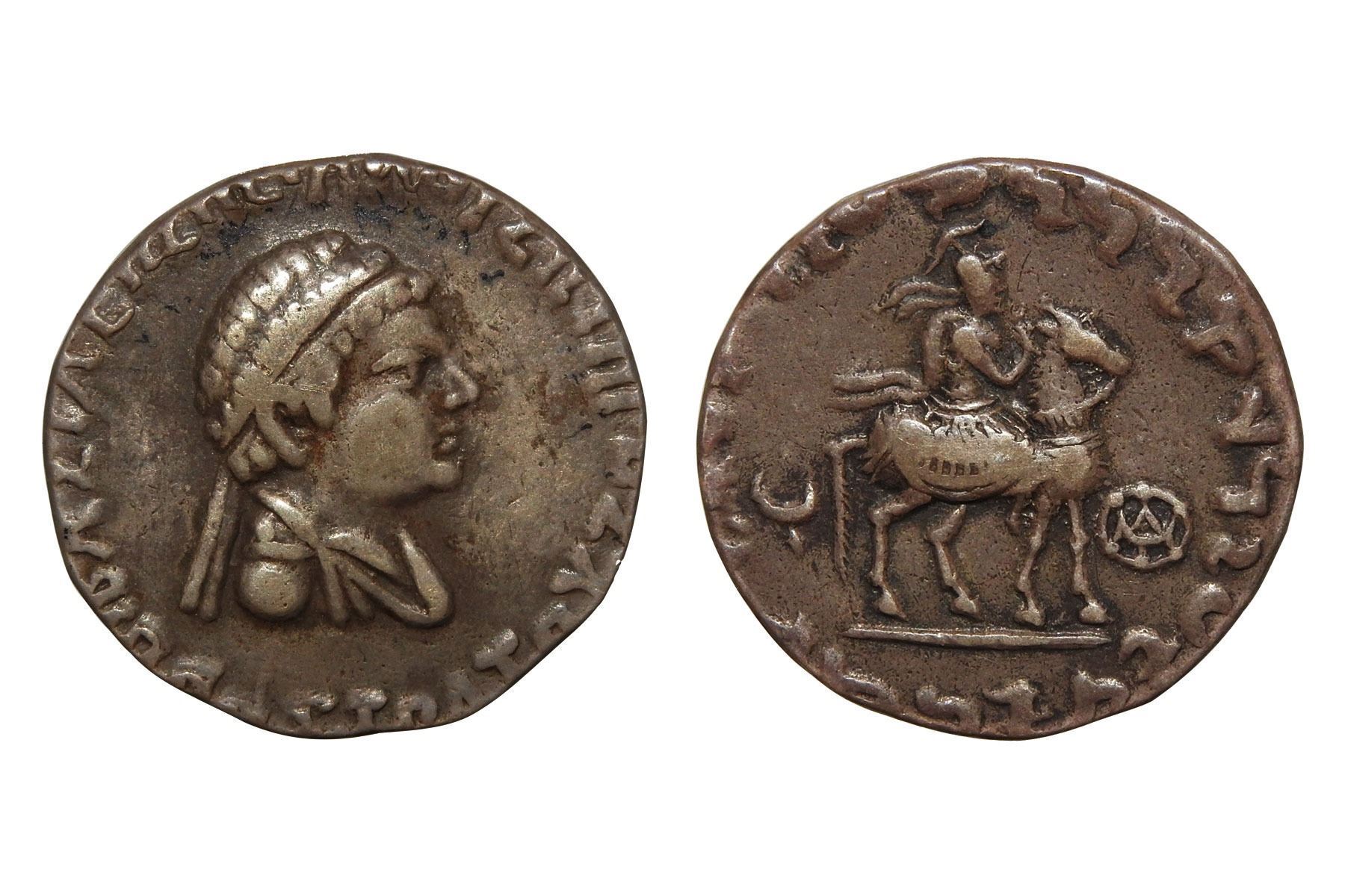 Indo-Greek Coinage, Hippostratos (c. 65-55 BCE) – Silver TetraDrachm, weighing 10.50g Obv: featuring a diademed bust of Hippostratos, facing right. Rev: Maharajasa tratarasa Hipusratasa (of Great King Hippostratos the Savior), depicting a helmeted and armored king riding a horse, standing right. A monogram appears to the right. The coin was likely minted in Gandhara or the western Punjab. Cataloged in Bopearachchi Series 7, ODH#451 Uncleaned, Extra Fine+, Exceedingly Rare