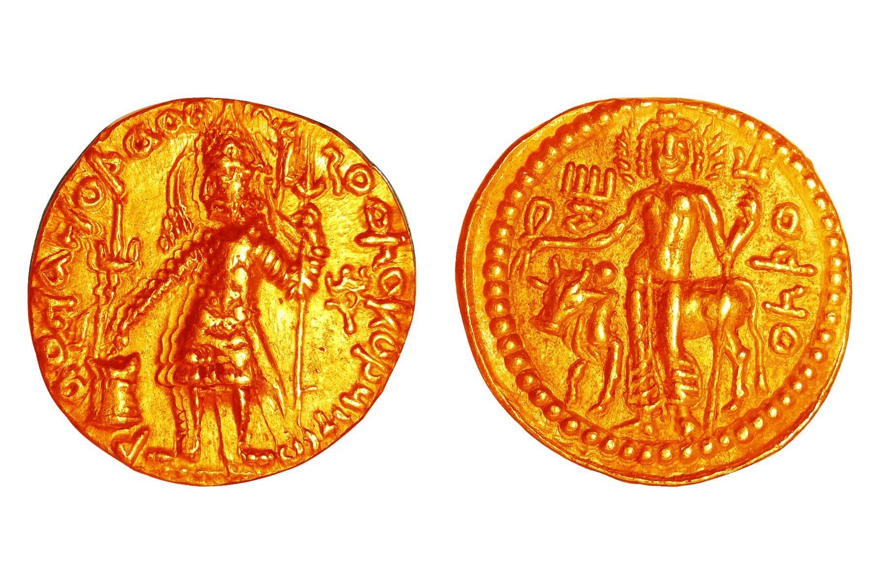 Kushanas – Vasudeva I (c. 195-230 CE), Gold Dinara, 8.00grms, Obv: King Vasudeva I is depicted standing, facing forward with his head turned left. Flames emanate from his shoulder as he holds a trident in his right hand while making an offering at an altar to the left. A Bactrian legend encircles the design. Rev: The god Shiva stands facing, positioned before the Nandi bull. Shiva holds a trident in his right hand and a noose in his left, with a tamgha in the upper left field and the label Ohpo beneath. All within a dotted border (Mitch ACW 3389). Note: In Extremely Fine condition, Rare.