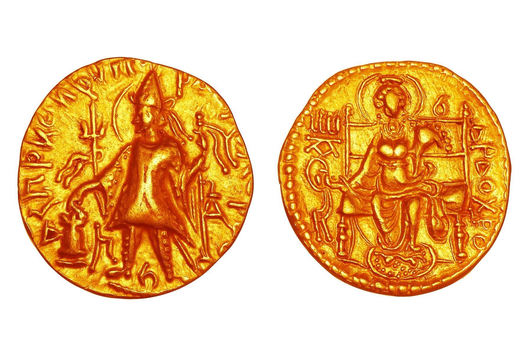 Kushana Empire, – Kanishka II (c. 230-240 CE), Gold Dinar, 7.80grms, Obv: King Kanishka II is depicted standing to the left, holding a trident in his right hand while making an offering at an altar to the left. Above the altar, a garlanded trident is shown, with the Brahmi letters 'Vi' to the right and 'Bh' to the left of his legs. Rev: The nimbate deity Ardoksho is seated on a throne, facing forward, holding a garland and cornucopia.