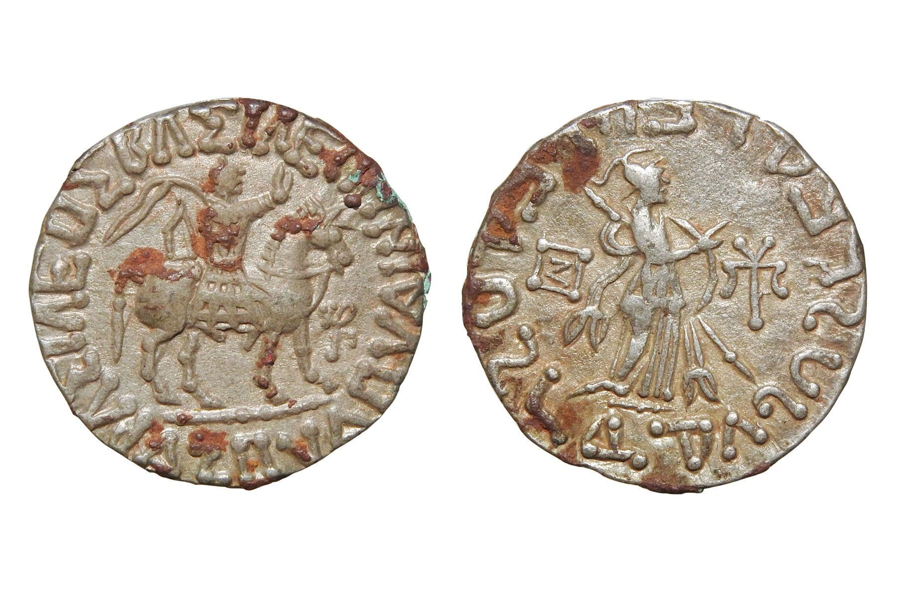 Indo-Scythians, Azes (c. 58-12 BCE), Silver Tetradrachm, Weight: 9.50 grams, Obv: Armored Scythian king advancing right on horseback, holding elephant goad. Kharoshthi letter to right. Rev: Kharoshthi legend Maharajasa rajarajasa mahatasa Ayasa ("Of Great King, King of Kings Azes the Great"). Athena standing right, holding spear and shield, and making benediction gesture.