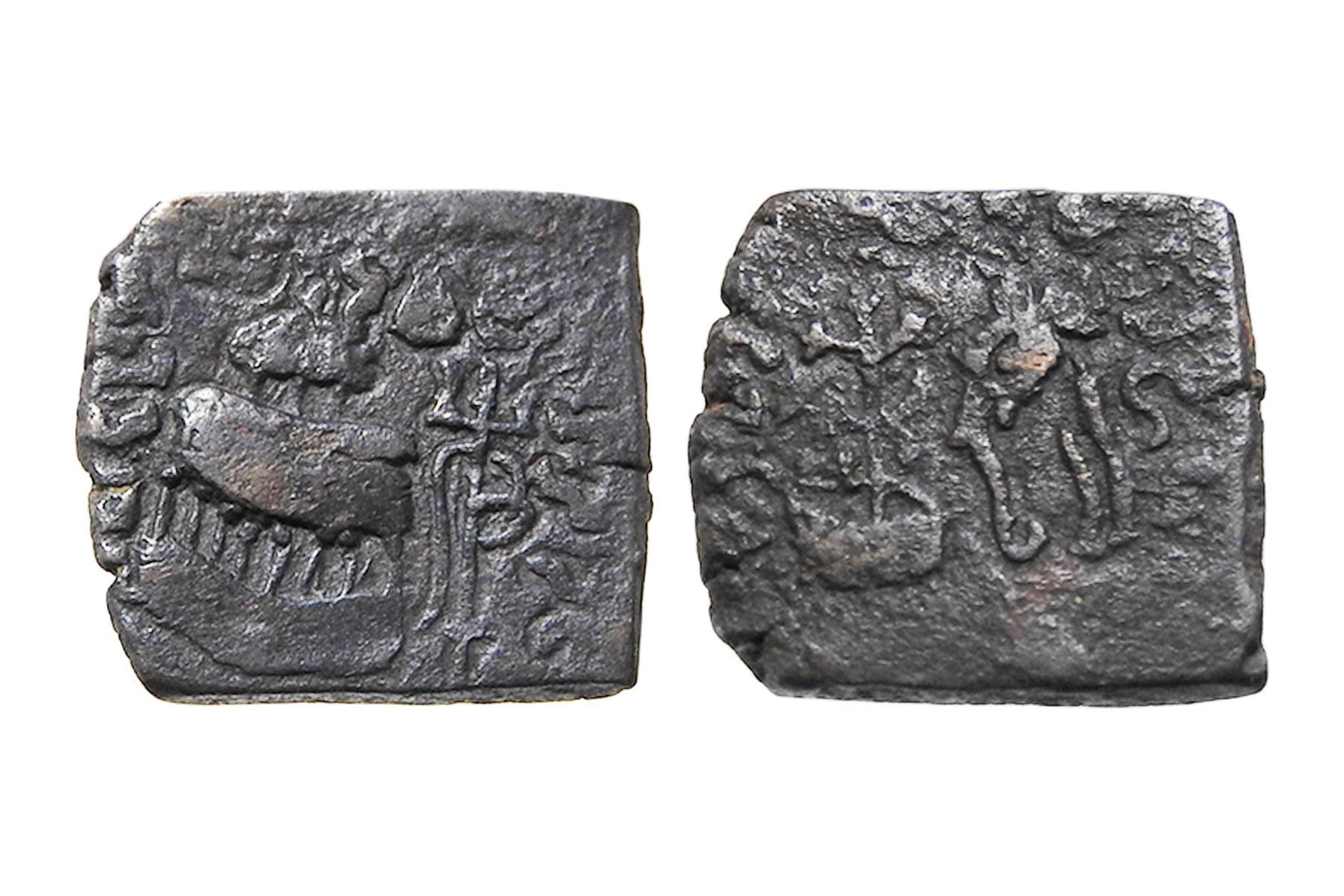 Audumbara (1st Century BCE), Rudradasa, Copper Unit, 2.30 grms, Obv: Temple, trident-axe on right, Br?hm? legend mah?devasa raña (on top) rudradasa (right) odubarisa (left). Rev: Railed tree, forepart of elephant on right, riverline below, Kharo?th? legend of which rudradasa is visible on left. AIC#1032, Very Rare in this condition
