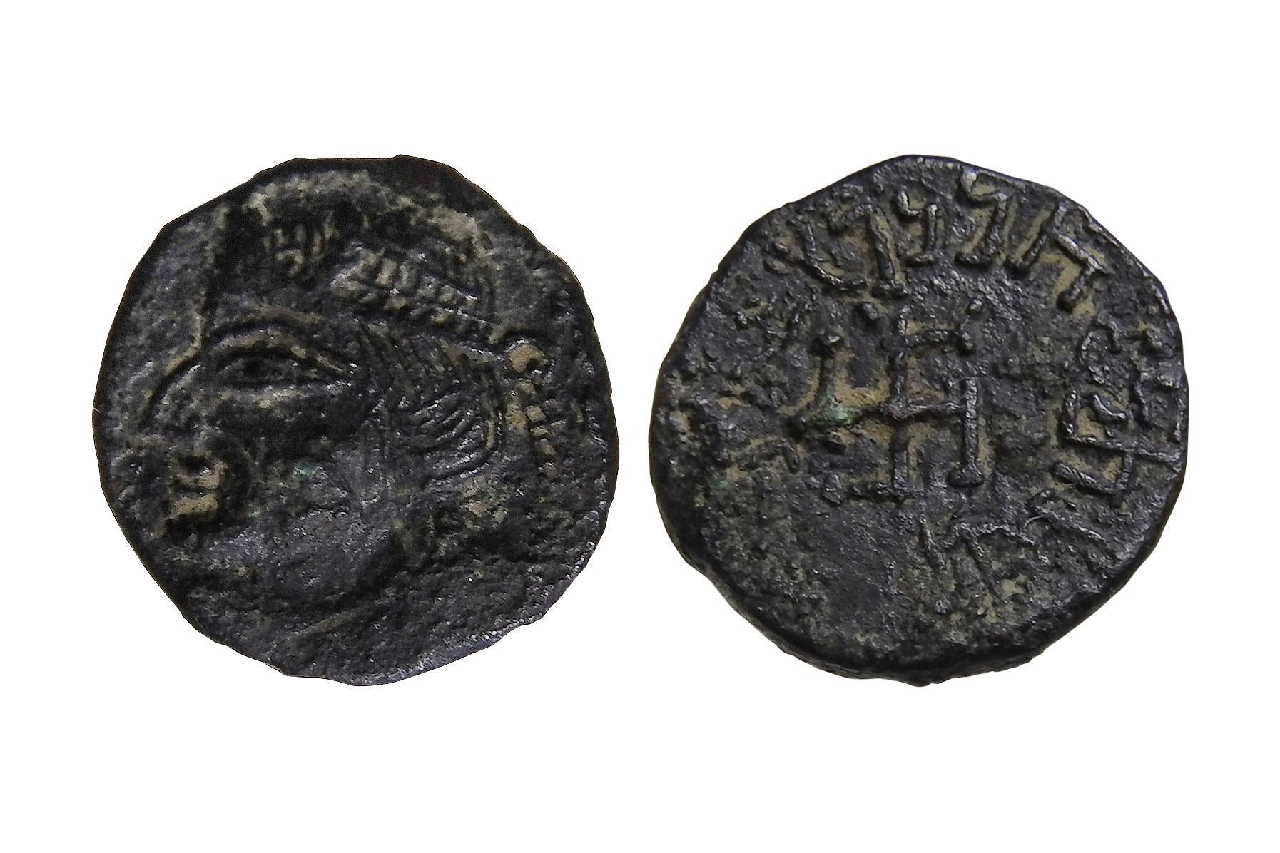 Rev: Right-turning swastika with the Kharosth? inscription around: Koziyasa Kozanaputra Paratar?ja. Very