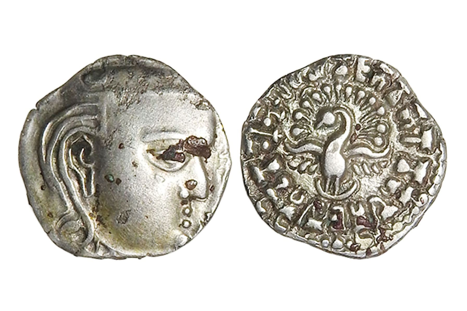 Madhyadesha Type), 1.80 grams, Obv: Exceptionally detailed bust of the king facing right, Rev: A peacock
