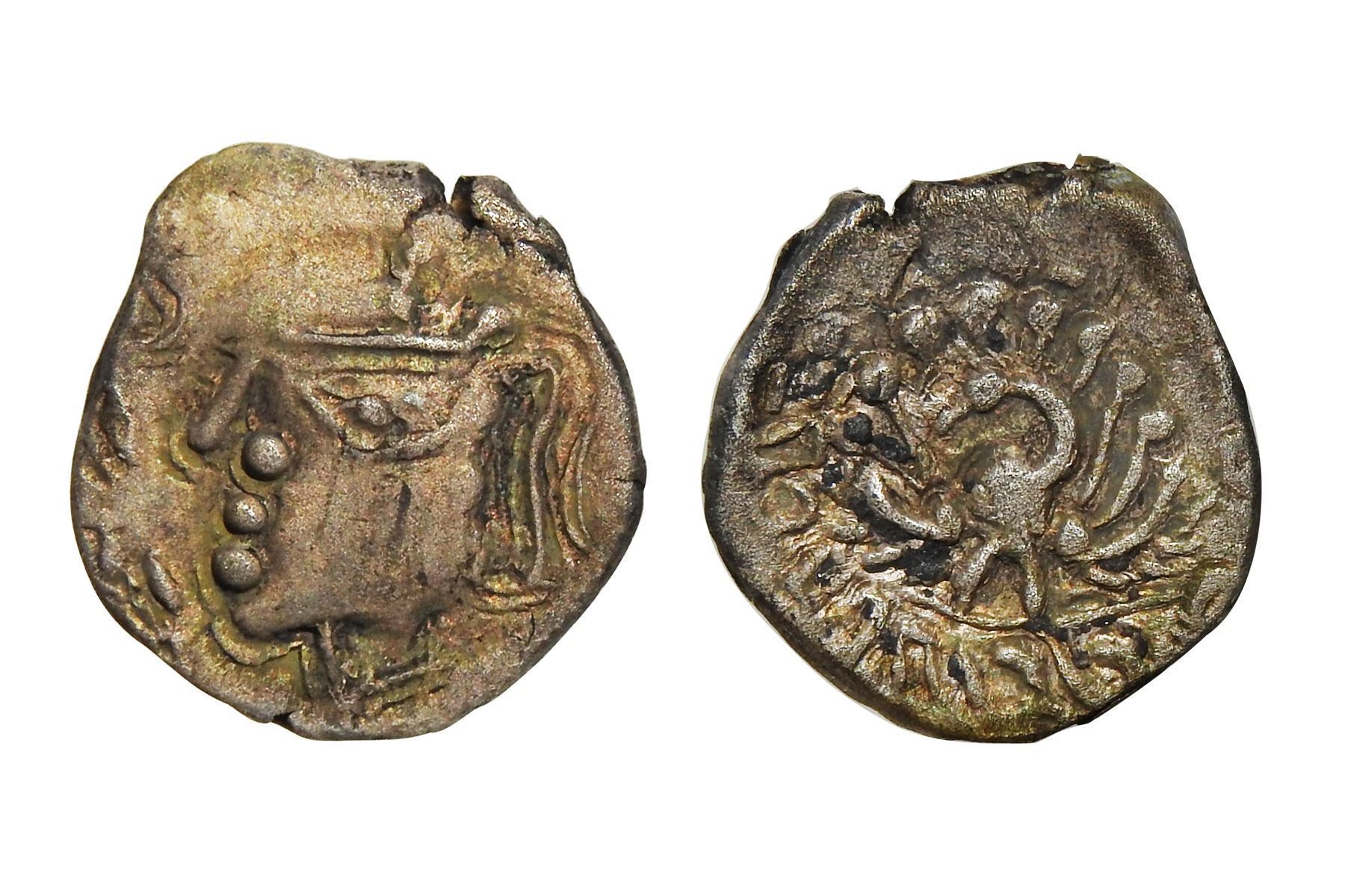 grams, Obv: Bust of King Siladitya facing left. Rev: Garuda, with the Brahmi legend: