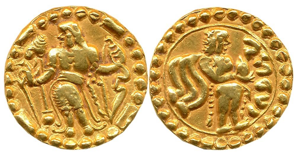 Post Gupta Bengal, Samatata region, Anonymous, Debased Gold Dinar, 5.79g, Obv: King standing facing left, holding a bow in his left hand and arrow in his right hand, Sankh shell standard in left field, no legend, Rev: Within circle winged Goddess standing right holding an object in right hand, grabbled legend on right. Both sides within a circle of large dotted border (ECB# SAM3.2). About extremely fine.