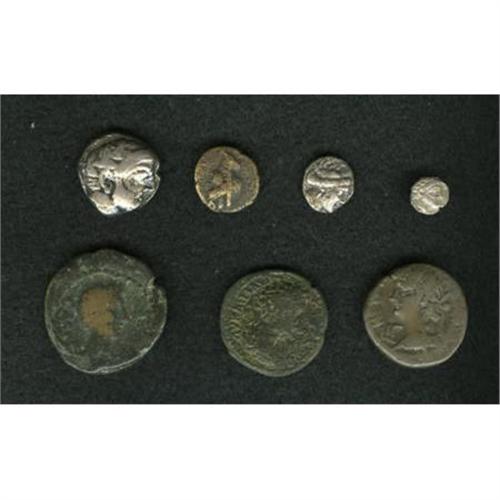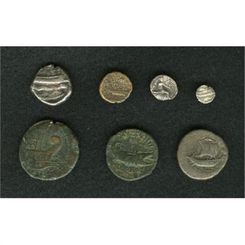 <B>Lot of seven miscellaneous Greek and Roman Provincial coins depicting war galleys.</B></I> Includes: Euboia, Histiaia. AR tetrobol // Mysia, Cyzicus. Commodus. AE // Phoenicia, Arados. AR stater // Same. AR obol // Phoenicia, Sidon. Imperial times. AE // Roman Egypt. Nero. AR tetradrachm // Uncertain. Augustus. Average Fair to VF.<BR><BR><b>Shipping:</b> Coins & Currency (<a target="_blank" href="http://www.heritageauctions.com/common/shipping.php">view shipping information</a>)