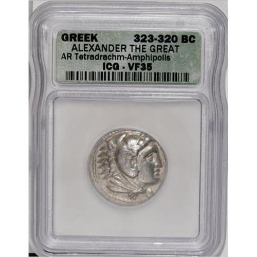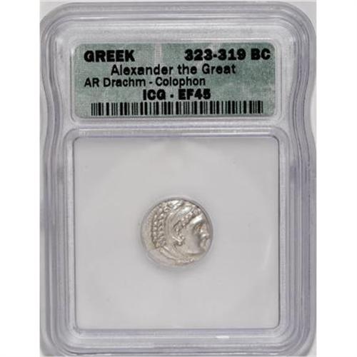 <B>Lot of two certified Macedonian coins of Alexander the Great.</B></I> Includes: AR tetradrachm. Amphipolis. VF35 ICG // AR drachm. Kolophon. XF45 ICG. <BR><BR><b>Shipping:</b> Coins & Currency (<a target="_blank" href="http://www.heritageauctions.com/common/shipping.php">view shipping information</a>)