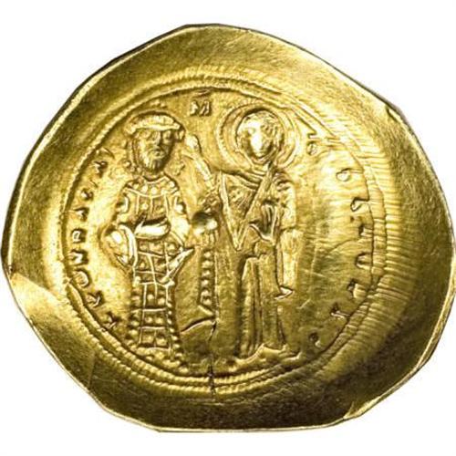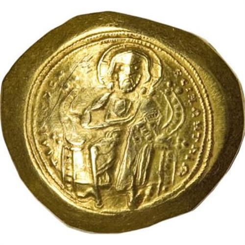 <B>Constantine X.</B></I> 1059-1067. AV histamenon nomisma (27 mm, 4.36 g). Constantinople. Christ seated facing on lyre-backed throne, holding Gospels / The Virgin, nimbate, standing facing, crowning Constantine, standing facing, holding globus cruciger. DOC 2; SB 1848. VF, obverse scratch, a little crudely struck.<BR><BR><b>Shipping:</b> Coins & Currency (<a target="_blank" href="http://www.heritageauctions.com/common/shipping.php">view shipping information</a>)