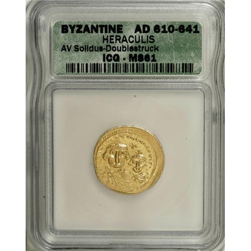 <B>Heraclius.</B></I> A.D. 610-641. AV solidus (21 mm). Constantinople, ca. A.D. 616-625. Crowned facing busts of Heraclius and Heraclius Constantine; cross between / Cross potent on three steps; I/CONOB. DOC 13i; SB 738. MS61 ICG. <BR><I>From the Marrero Family Collection.</B></I><BR><BR><b>Shipping:</b> Coins & Currency (<a target="_blank" href="http://www.heritageauctions.com/common/shipping.php">view shipping information</a>)