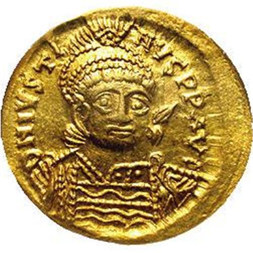 <B>Justin I.</B></I> A.D. 518-527. AV solidus (19 mm). Constantinople, A.D. 518-519. Diademed, helmeted and cuirassed bust facing slightly right, holding spear and shield / Victory standing left, holding jeweled P-headed cross; star in left field; H/CONOB. DOC I 1g; SB 55. AU53 ICG. <BR><I>From the Marrero Family Collection.</B></I><BR><BR><b>Shipping:</b> Coins & Currency (<a target="_blank" href="http://www.heritageauctions.com/common/shipping.php">view shipping information</a>)