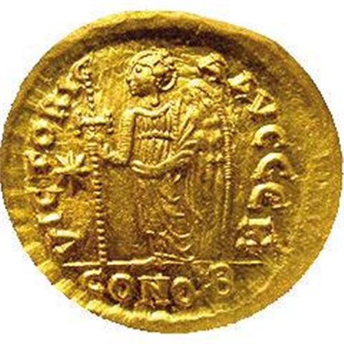 <B>Justin I.</B></I> A.D. 518-527. AV solidus (19 mm). Constantinople, A.D. 518-519. Diademed, helmeted and cuirassed bust facing slightly right, holding spear and shield / Victory standing left, holding jeweled P-headed cross; star in left field; H/CONOB. DOC I 1g; SB 55. AU53 ICG. <BR><I>From the Marrero Family Collection.</B></I><BR><BR><b>Shipping:</b> Coins & Currency (<a target="_blank" href="http://www.heritageauctions.com/common/shipping.php">view shipping information</a>)