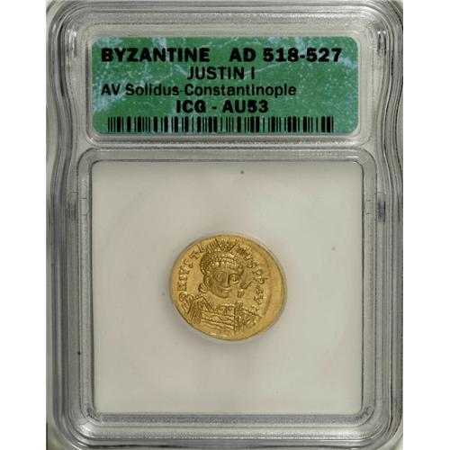 <B>Justin I.</B></I> A.D. 518-527. AV solidus (19 mm). Constantinople, A.D. 518-519. Diademed, helmeted and cuirassed bust facing slightly right, holding spear and shield / Victory standing left, holding jeweled P-headed cross; star in left field; H/CONOB. DOC I 1g; SB 55. AU53 ICG. <BR><I>From the Marrero Family Collection.</B></I><BR><BR><b>Shipping:</b> Coins & Currency (<a target="_blank" href="http://www.heritageauctions.com/common/shipping.php">view shipping information</a>)