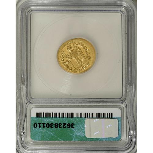 <B>Justin I.</B></I> A.D. 518-527. AV solidus (19 mm). Constantinople, A.D. 518-519. Diademed, helmeted and cuirassed bust facing slightly right, holding spear and shield / Victory standing left, holding jeweled P-headed cross; star in left field; H/CONOB. DOC I 1g; SB 55. AU53 ICG. <BR><I>From the Marrero Family Collection.</B></I><BR><BR><b>Shipping:</b> Coins & Currency (<a target="_blank" href="http://www.heritageauctions.com/common/shipping.php">view shipping information</a>)
