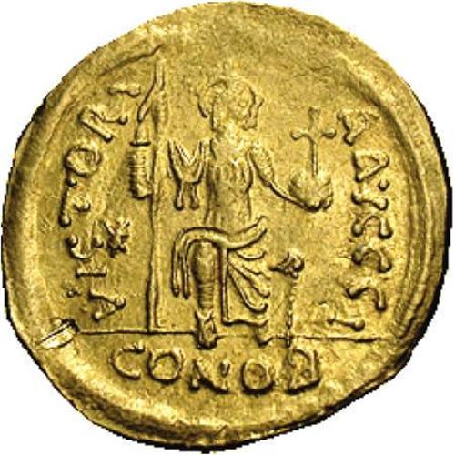 <B>Justin II.</B></I> A.D. 565-578. AV solidus (19 mm, 4.34 g). Constantinople. Helmeted and cuirassed facing bust, holding Victory on globe and shield / Constantinopolis seated facing, head right, holding sceptre and globus cruciger; star in right field; I/CONOB. DOC 5e; SB 346. VF.<BR><BR><b>Shipping:</b> Coins & Currency (<a target="_blank" href="http://www.heritageauctions.com/common/shipping.php">view shipping information</a>)