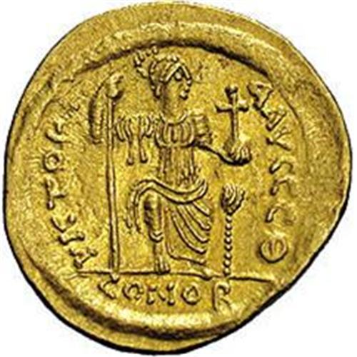 <B>Justin II.</B></I> A.D. 565-578. AV solidus (21 mm, 4.49 g). Constantinople. Diademed, helmeted and cuirassed bust facing, holding Victory on globe / Constantinopolis enthroned facing, head right, holding sceptre and globus cruciger; Theta/CONOB. DOC 4h; SB 345. VF.<BR><BR><b>Shipping:</b> Coins & Currency (<a target="_blank" href="http://www.heritageauctions.com/common/shipping.php">view shipping information</a>)