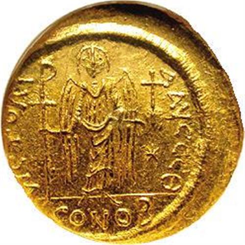 <B>Justinian I.</B></I> A.D. 527-565. AV solidus (19 mm). Constantinople, A.D. 545-565. Diademed, helmeted and cuirassed bust facing slightly right, holding spear and shield / Angel standing facing, holding long staff surmounted by a Christogram and globus cruciger; star in right field; (Theta)/CONOB. DOC 9i; SB 140. AU NGC. <BR><I>From the Marrero Family Collection.</B></I><BR><BR><b>Shipping:</b> Coins & Currency (<a target="_blank" href="http://www.heritageauctions.com/common/shipping.php">view shipping information</a>)