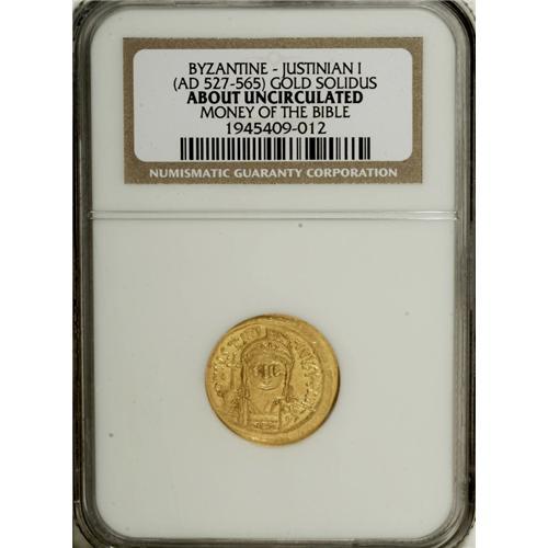 <B>Justinian I.</B></I> A.D. 527-565. AV solidus (19 mm). Constantinople, A.D. 545-565. Diademed, helmeted and cuirassed bust facing slightly right, holding spear and shield / Angel standing facing, holding long staff surmounted by a Christogram and globus cruciger; star in right field; (Theta)/CONOB. DOC 9i; SB 140. AU NGC. <BR><I>From the Marrero Family Collection.</B></I><BR><BR><b>Shipping:</b> Coins & Currency (<a target="_blank" href="http://www.heritageauctions.com/common/shipping.php">view shipping information</a>)