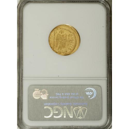 <B>Justinian I.</B></I> A.D. 527-565. AV solidus (19 mm). Constantinople, A.D. 545-565. Diademed, helmeted and cuirassed bust facing slightly right, holding spear and shield / Angel standing facing, holding long staff surmounted by a Christogram and globus cruciger; star in right field; (Theta)/CONOB. DOC 9i; SB 140. AU NGC. <BR><I>From the Marrero Family Collection.</B></I><BR><BR><b>Shipping:</b> Coins & Currency (<a target="_blank" href="http://www.heritageauctions.com/common/shipping.php">view shipping information</a>)