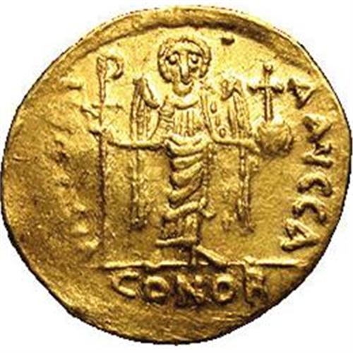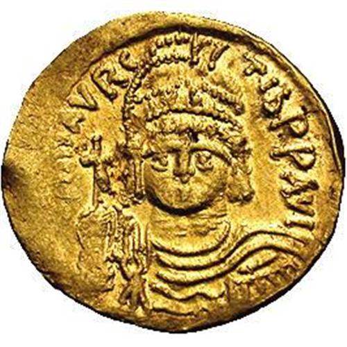 <B>Maurice Tiberius.</B></I> A.D. 582-602. AV solidus (21 mm, 4.46 g). Constantinople, A.D. 583-601. Helmeted and cuirassed facing bust, holding globus cruciger / Angel standing facing, holding long P-headed cross and globus cruciger; A/CONOB. DOC 5a; SB 478. VF. <BR><I>From the Marrero Family Collection.</B></I><BR><BR><b>Shipping:</b> Coins & Currency (<a target="_blank" href="http://www.heritageauctions.com/common/shipping.php">view shipping information</a>)