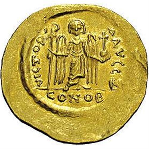 <B>Maurice Tiberius.</B></I> A.D. 582-602. AV solidus (23 mm, 4.47 g). Constantinople, A.D. 583-601. Helmeted and cuirassed facing bust, holding globus cruciger / Angel standing facing, holding long P-headed cross and globus cruciger; Z/CONOB. DOC 5g; SB 478. Good VF.<BR><BR><b>Shipping:</b> Coins & Currency (<a target="_blank" href="http://www.heritageauctions.com/common/shipping.php">view shipping information</a>)