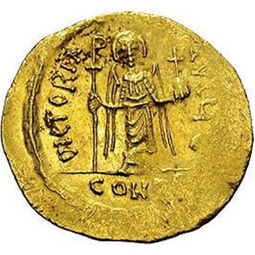 <B>Phocas.</B></I> A.D. 602-610. AV solidus (21 mm, 4.48 g). Constantinople, A.D. 607-610. Crowned facing bust, holding cross / Angel standing facing, holding long P-headed cross and globus cruciger; E/CONOB. DOC 10e; SB 620. VF, some striking flatness.<BR><BR><b>Shipping:</b> Coins & Currency (<a target="_blank" href="http://www.heritageauctions.com/common/shipping.php">view shipping information</a>)