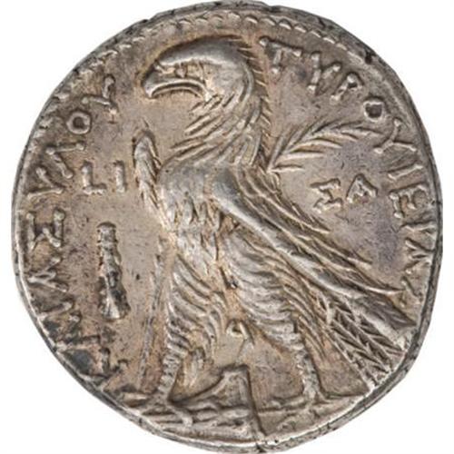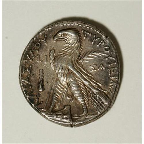 <B>Phoenicia, Tyre.</B></I> 126/5 B.C.-A.D. 65. AR shekel (27 mm, 14.26 g). Year 10 (117/6 B.C.). Laureate head of Melqart right / Eagle standing left on prow, palm over wing; date and club before, letters behind, Phoenician letter between legs. Cf. BMC p. 236, 67. Toned, near XF, well centered, tight flan. Scarce early issue. <I>Ex Springfield Collection (Bowers & Ruddy, 15-18 December 1981), 3084.</B></I><BR><BR><b>Shipping:</b> Coins & Currency (<a target="_blank" href="http://www.heritageauctions.com/common/shipping.php">view shipping information</a>)
