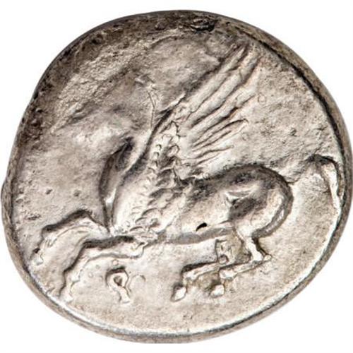 <B>Corinthia, Corinth.</B></I> Ca. 345-307 B.C. AR stater (19 mm, 8.25 g). Pegasos flying left / Helmeted head of Athena left; helmet behind. Pegasi I p. 263, 431; Ravel 1013. VF, bright surfaces, area of horn silver on reverse.<BR><BR><b>Shipping:</b> Coins & Currency (<a target="_blank" href="http://www.heritageauctions.com/common/shipping.php">view shipping information</a>)