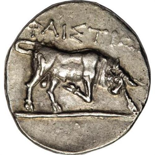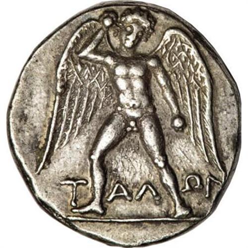 <B>Crete, Phaistos.</B></I> Ca. 280 B.C. AR stater (23 mm, 11.21 g). Talos advancing left, head facing, about to hurl stone held in hand, another stone in the other hand / Bull butting right. Le Rider p. 96, 62, pl. XXIV, 4; Svoronos p. 264, 67, pl. XXIV, 24; BMC p. 64, 20, pl. XV, 11. Toned XF. Very rare and of exceptional quality. A true masterpiece of Greek numismatic art. <I>According to myth, the giant Talos was formed by Hephaistos out of bronze in order to serve king Minos to guard the island of Crete. The beast circled the island three times daily and kept away all passing ships with a hail of stones, and anyone so unfortunate to be captured by him suffered the most horrible fate, roasting to death as the monster heated himself until white hot while clasping his prey in his arms. Telos was killed by the Argonauts with the aid of a charm produced by Medeia.</B></I><BR><BR><b>Shipping:</b> Coins & Currency (<a target="_blank" href="http://www.heritageauctions.com/common/shipping.php">view shipping information</a>)