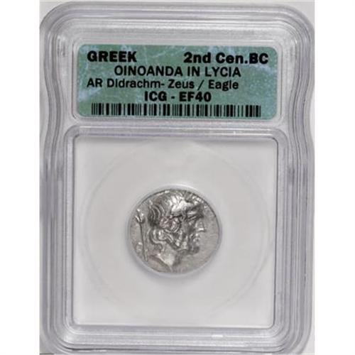 <B>Lycia, Oinoanda.</B></I> Ca. 200 B.C. AR didrachm (21 mm). Laureate head of Zeus right, lotus-tipped sceptre over shoulder; B behind / Eagle, wings closed, standing right on winged thunderbolt; Gamma and grape bunch in right field. Cf. BMC p. 73, 1. XF40 ICG.<BR><BR><b>Shipping:</b> Coins & Currency (<a target="_blank" href="http://www.heritageauctions.com/common/shipping.php">view shipping information</a>)