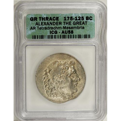<B>Macedonian Kingdom. Alexander III.</B></I> 336-323 B.C. AR tetradrachm (28 mm). Mesembria, ca. 175-150 B.C. Head of Herakles right, wearing lion's skin headdress / Zeus seated left, holding eagle and sceptre; helmet and MA in left field, KO below throne. Price 1077. AU58 ICG. <BR><BR><b>Shipping:</b> Coins & Currency (<a target="_blank" href="http://www.heritageauctions.com/common/shipping.php">view shipping information</a>)